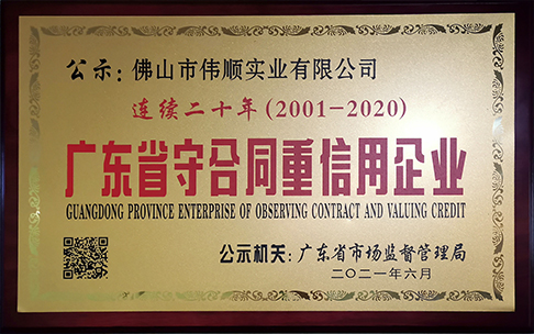- 佛山市偉順實(shí)業(yè)有限公司被廣東省市場(chǎng)監(jiān)督管理局授予連續(xù)二十年(2001-2020)廣東省守合同重信用企業(yè)稱號(hào)。