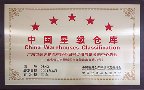 - 廣東世必達(dá)物流有限公司棉紗供應(yīng)鏈金融中心被中國倉儲(chǔ)與配送協(xié)會(huì)評(píng)定為中國五星級(jí)倉庫。